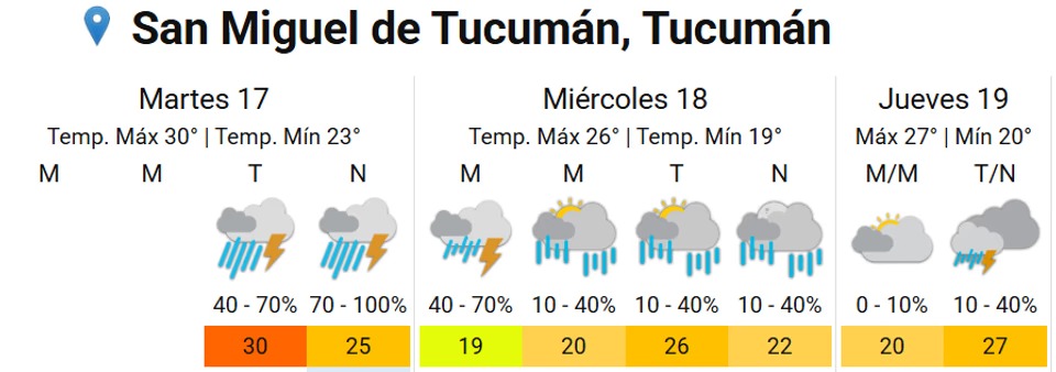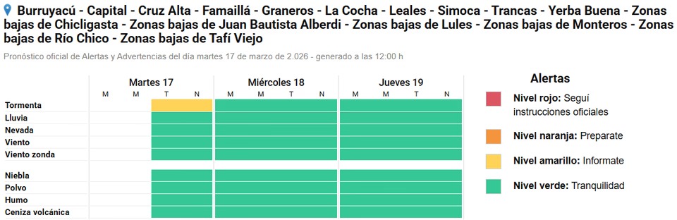 El área será afectada por tormentas de variada intensidad, algunas fuertes o puntualmente severas. Las mismas podrían estar acompañadas por actividad eléctrica frecuente, granizo, ráfagas de hasta 90 km/h y abundantes lluvias en cortos períodos. Se prevén valores de precipitación acumulada entre 25 y 50 mm, que pueden ser superados de manera local.