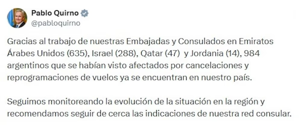 En los últimos días llegaron distintos aviones con pasajeros argentinos evacuados. De acuerdo con el comunicado, que compartió Quirno, a través de su cuenta oficial de X, 635 estaban en Emiratos Árabes Unidos, 288 en Israel, 47 en Qatar y 14 en Jordania.
