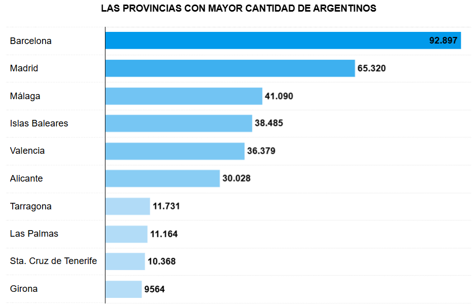 La provincia de Barcelona concentra la mayor cantidad de argentinos que viven en España. Según los datos oficiales, allí residen 92.897 personas nacidas en la Argentina, una cifra que la ubica como el principal polo provincial del país en términos absolutos y la distingue del resto de las jurisdicciones españolas.