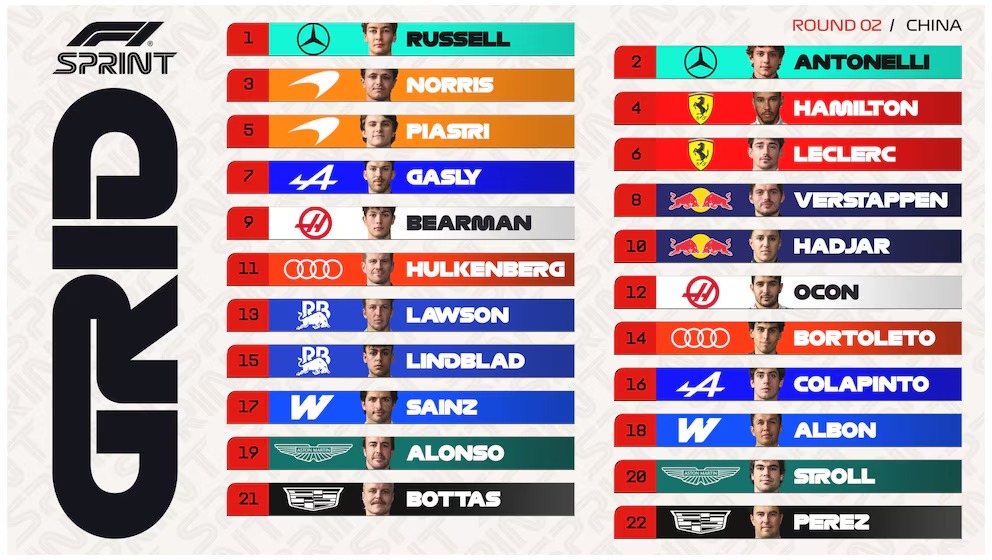 La primera carrera Sprint, de la temporada 2026 de la Fórmula 1, tendrá a los Mercedes en la primera fila: George Russell fue el más veloz en la clasificación del Gran Premio de China con una vuelta de 1:31.520, seguido por su compañero Andre Kimi Antonelli. La segunda fila de la grilla tendrá a Lando Norris con su McLaren y Lewis Hamilton al mando de la Ferrari.