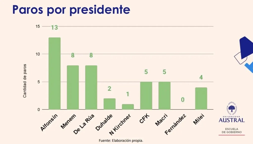 En cuanto al ranking de paros, lo encabeza Alfonsín, con 13 huelgas durante su mandato. A continuación, el ranking presidente por presidente: