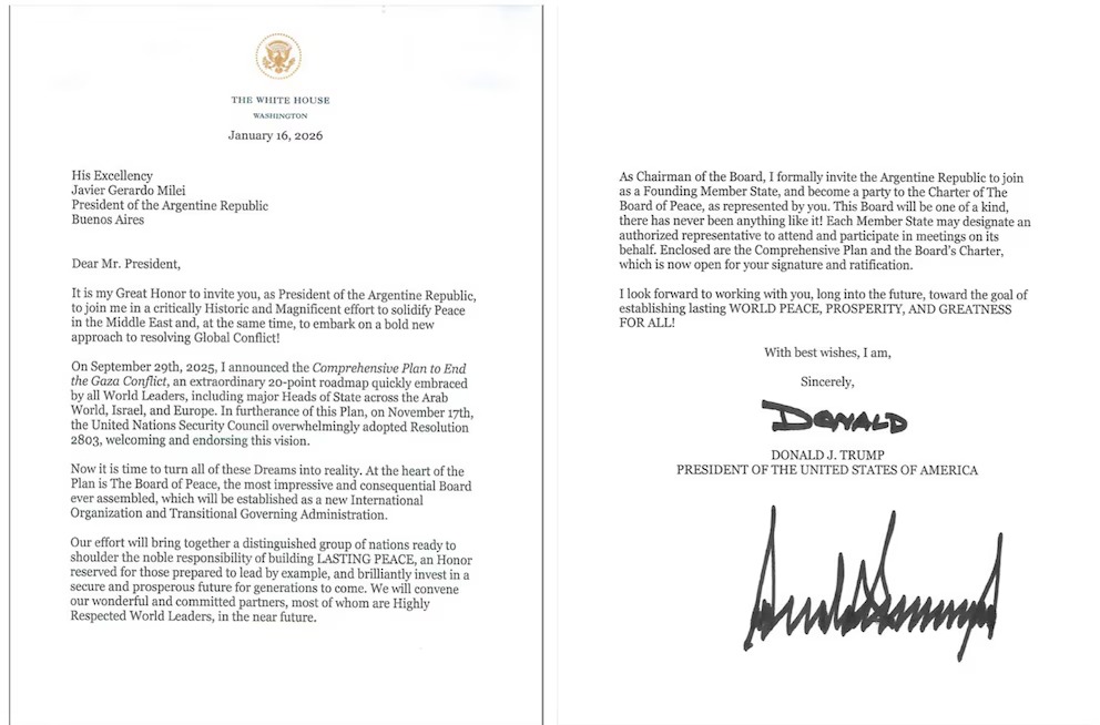 “Como presidente de la Junta, invito formalmente a la República Argentina a unirse como Estado miembro fundador y a formar parte del estatuto de la Junta de Paz, representada por usted”, escribió Trump.