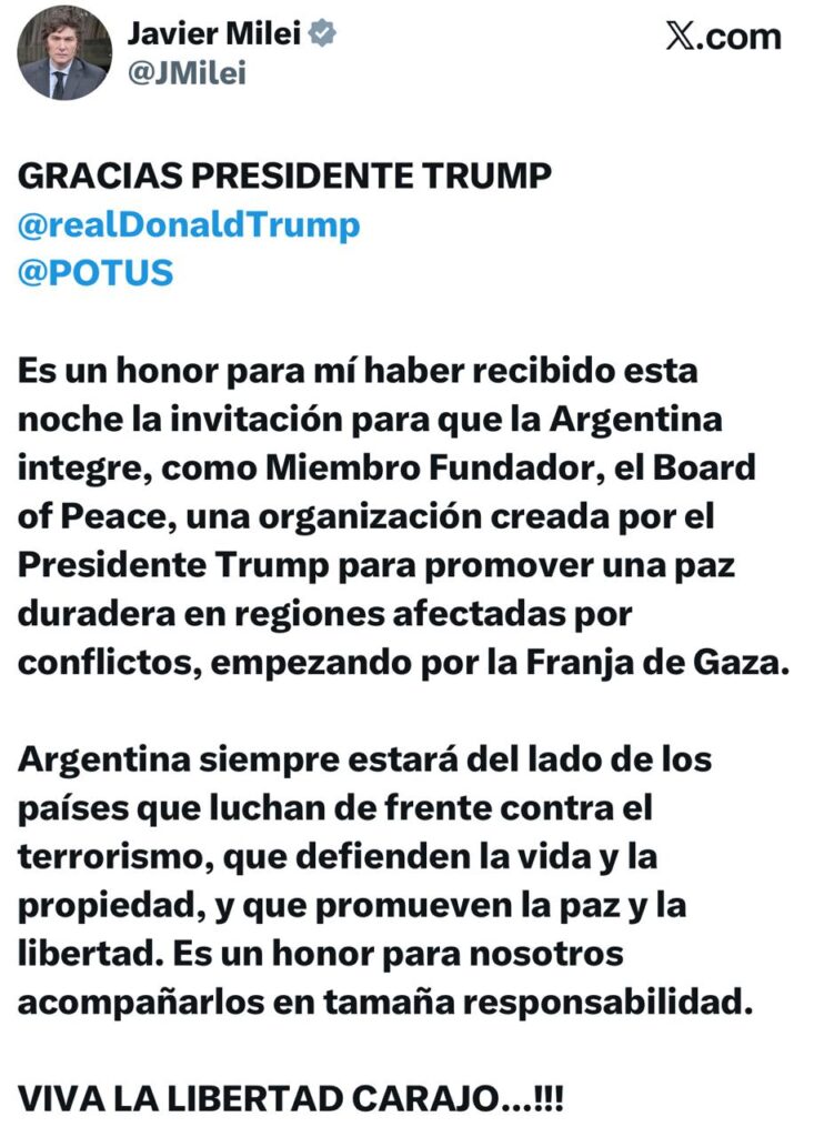 “Es un honor para mí haber recibido esta noche la invitación para que la Argentina integre, como Miembro Fundador, el Board of Peace”, escribió Milei en su mensaje, en el que precisó que se trata de “una organización creada por el Presidente Trump para promover una Paz duradera en regiones afectadas por conflictos, empezando por la Franja de Gaza”.