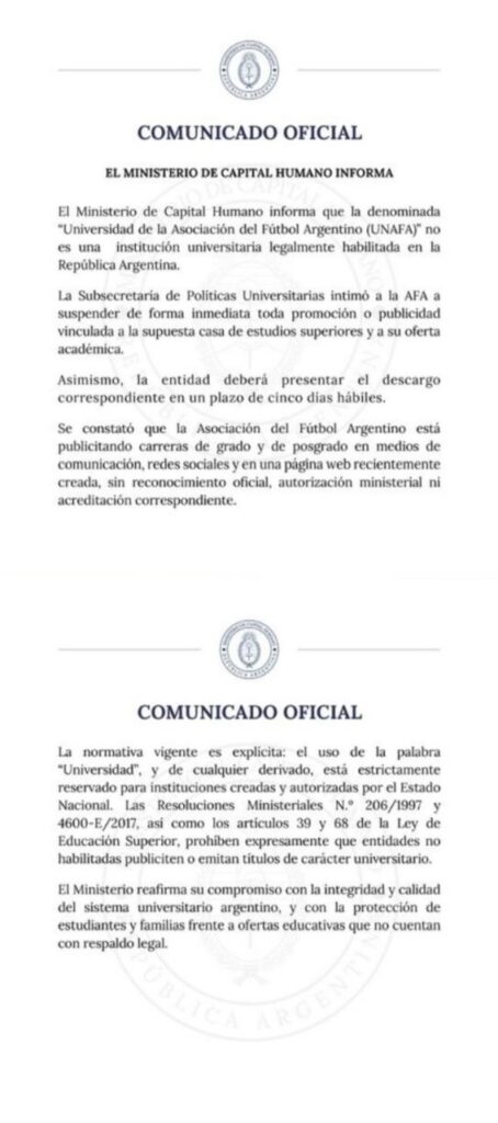 La advertencia se conoció este viernes con un comunicado del Ministerio de Capital Humano que señaló que “la denominada Universidad de la Asociación del Fútbol Argentino (UNAFA) no es una institución universitaria legalmente habilitada” en el país.