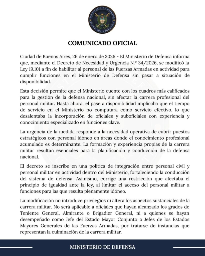 La medida se hizo mediante Decreto de Necesidad y Urgencia N.°34/2026 que modificó la Ley 19.101