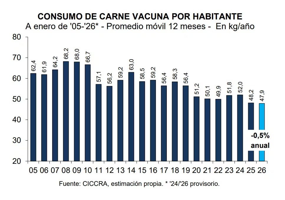 De acuerdo con el documento, el promedio móvil de los últimos doce meses del consumo por habitante se ubicó en 47,9 kilos/año al cierre del primer mes del año. Esta cifra representa una baja del 0,5% respecto al promedio registrado en enero de 2025 y consolida una tendencia decreciente que ha llevado este indicador a su punto más bajo en las últimas dos décadas.
