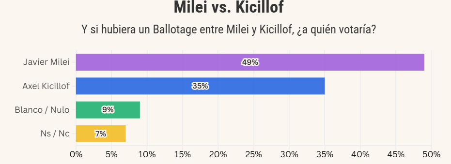 Ahora bien, en un eventual balotaje planteado por la consultora entre Javier Milei y Axel Kicillof, el actual Presidente obtendría el 49% de los votos, frente al 35% del gobernador bonaerense.