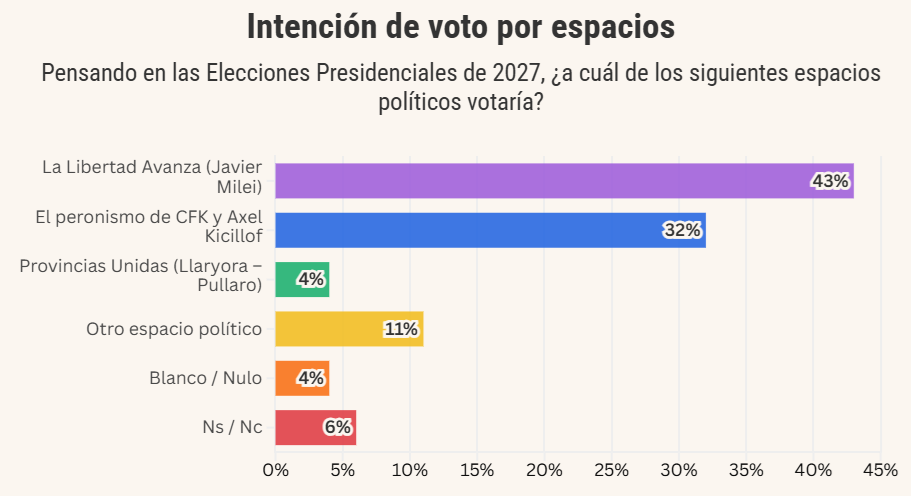 Ante la pregunta “pensando en las Elecciones Presidenciales de 2027, ¿a cuál de los siguientes espacios políticos votaría?“, los encuestados se inclinaron en un 43% por La Libertad Avanza de Javier Milei, y un 32% por el peronismo de Cristina Kirchner y Axel Kicillof juntos.