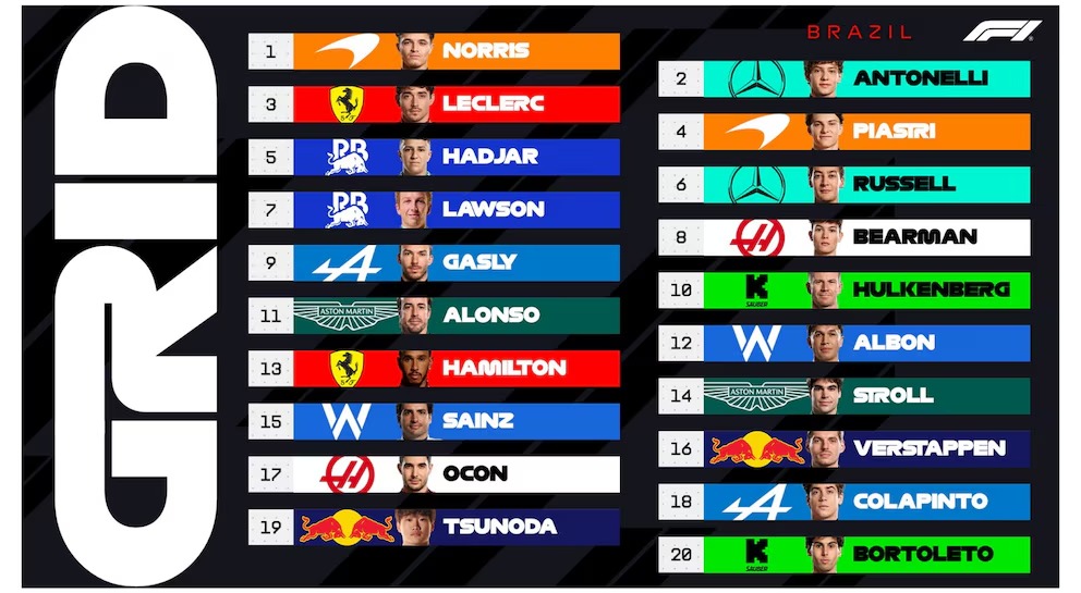 Tras ganar la sprint en el primer turno del sábado, Lando Norris se quedó con la pole position tras marcar un registro de 1:09.511. Detrás de él comenzarán Andrea Kimi Antonelli (2°), Charles Leclerc (3°) y Oscar Piastri (4°)