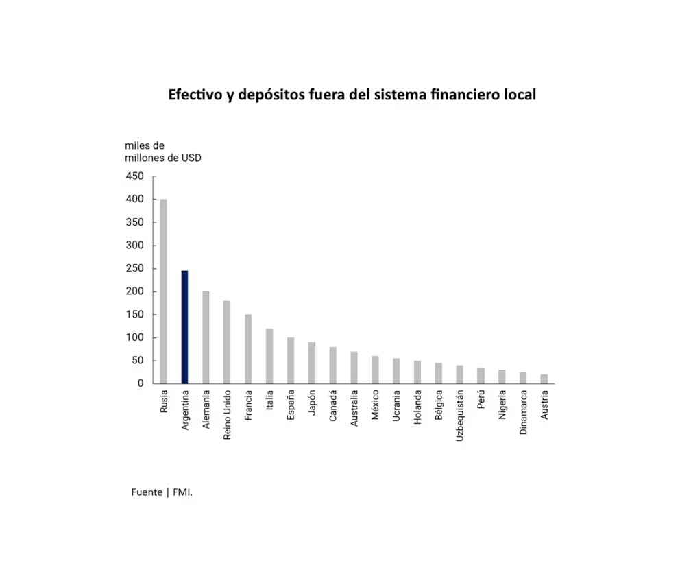 Según datos presentados por Vladimir Werning, vicepresidente del Banco Central de la República Argentina (BCRA), Argentina figura en el segundo puesto global en cuanto a efectivo y depósitos fuera del sistema financiero local, solo por detrás de Rusia. La suma alcanza aproximadamente USD 250.000 millones, un monto que supera a potencias económicas como Alemania, Reino Unido, Francia e Italia.