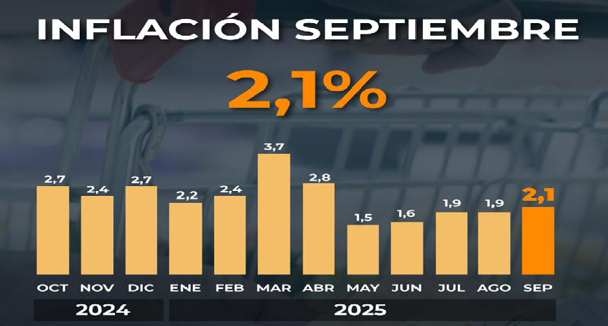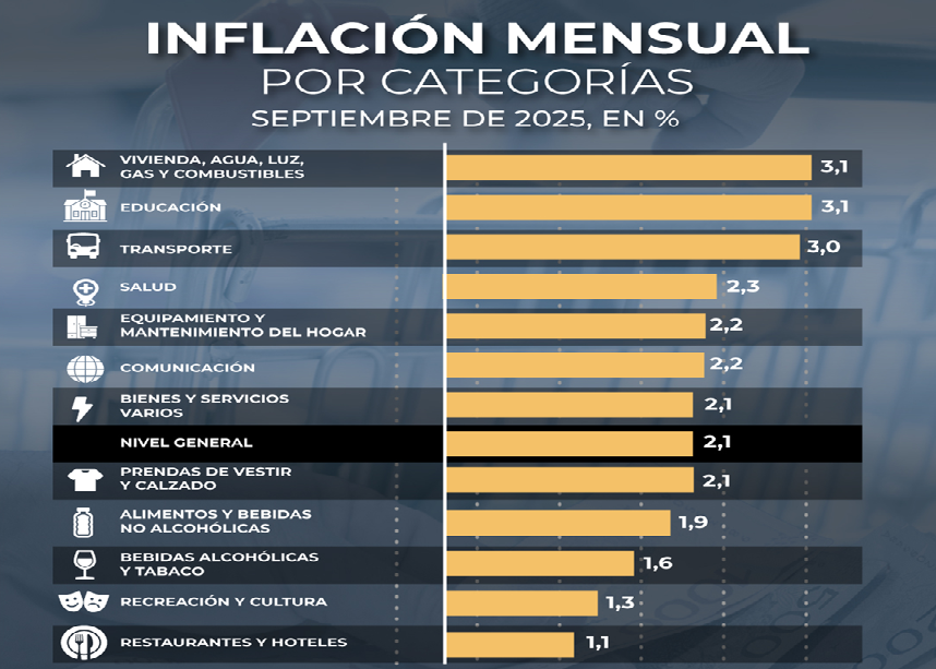 La inflación tuvo una leve aceleración en septiembre: fue del 2,1% según el Instituto Nacional de Estadística y Censos (INDEC). Con este dato, la variación para los últimos doce meses fue de 31,8% y acumuló 22% en lo que va del 2025.