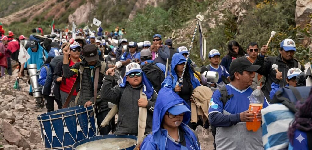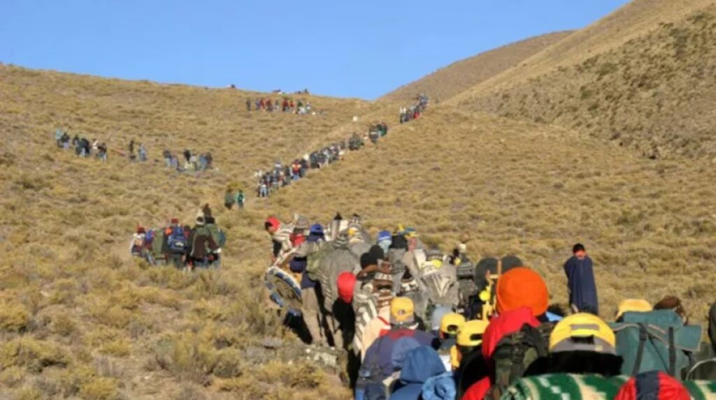 La mayoría marcha con la espalda abrumada por el agobio de la mochila cargada con agua y alimentos, la bolsa de dormir y la carpa bajo la que pernoctarán cerca de la que llaman con familiaridad “La Mamita del Cerro”, para cargarla en hombros al día siguiente en la bajada hasta Tumbaya. Los hombros soportan también el peso de los sikus, bombos y otros instrumentos de las bandas que musicalizarán el descenso. Son 150 de entre 10 y 20 integrantes cada una.