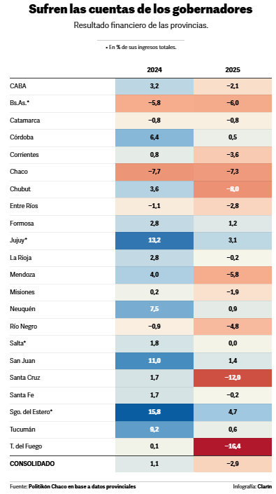 Las que pudieron mantenerse con superávit fueron Córdoba, Formosa, Jujuy, Neuquén, San Juan, Santiago del Estero y Tucumán. Incluso ellas también tuvieron un deterioro: en todos los casos el excedente fiscal con el que cerraron 2025 fue más bajo que el que tenían un año antes.