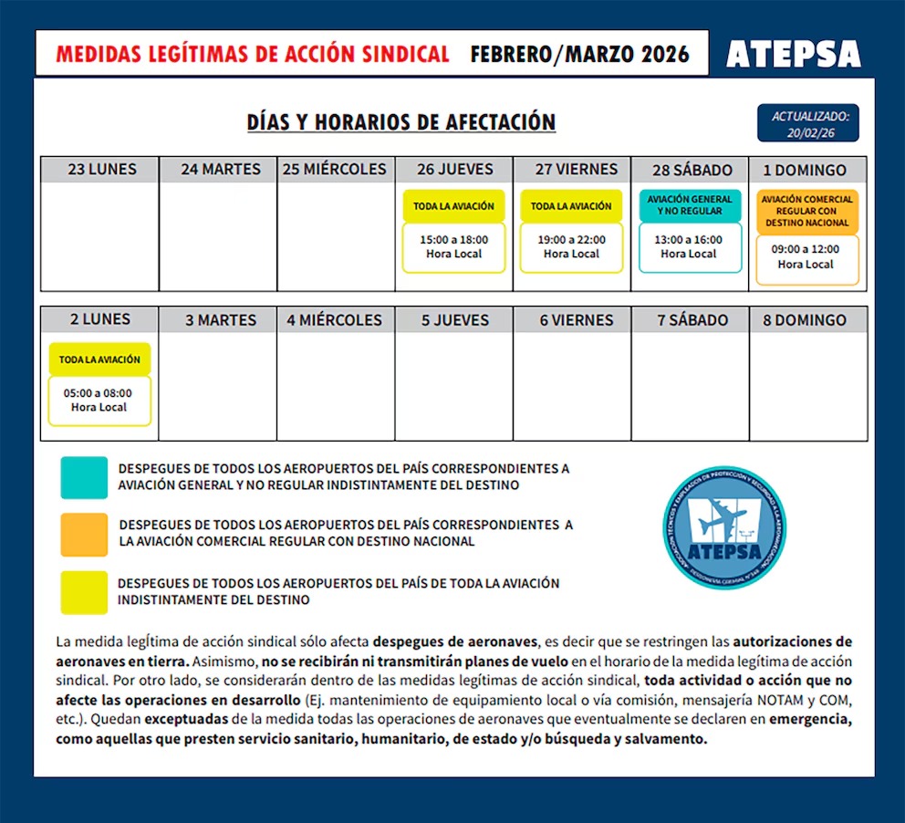 Según lo informado, la protesta abarcará franjas horarias escalonadas y restringirá exclusivamente la autorización para el despegue de aeronaves, sin afectar operaciones ya en curso. Serán varios días que, previsiblemente, haya demoras o reprogramaciones para algunos vuelos, a excepción de las aeronaves en emergencia, sanitarias, humanitarias, de Estado o búsqueda y salvamento: