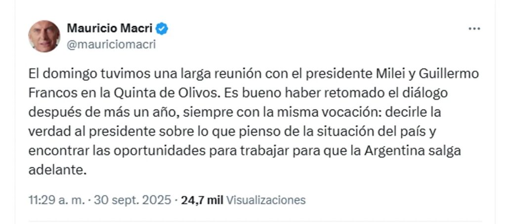 “El domingo tuvimos una larga reunión con el Presidente Milei y Guillermo Francos en la Quinta de Olivos. Es bueno haber retomado el diálogo después de más un año”, escribió Macri.