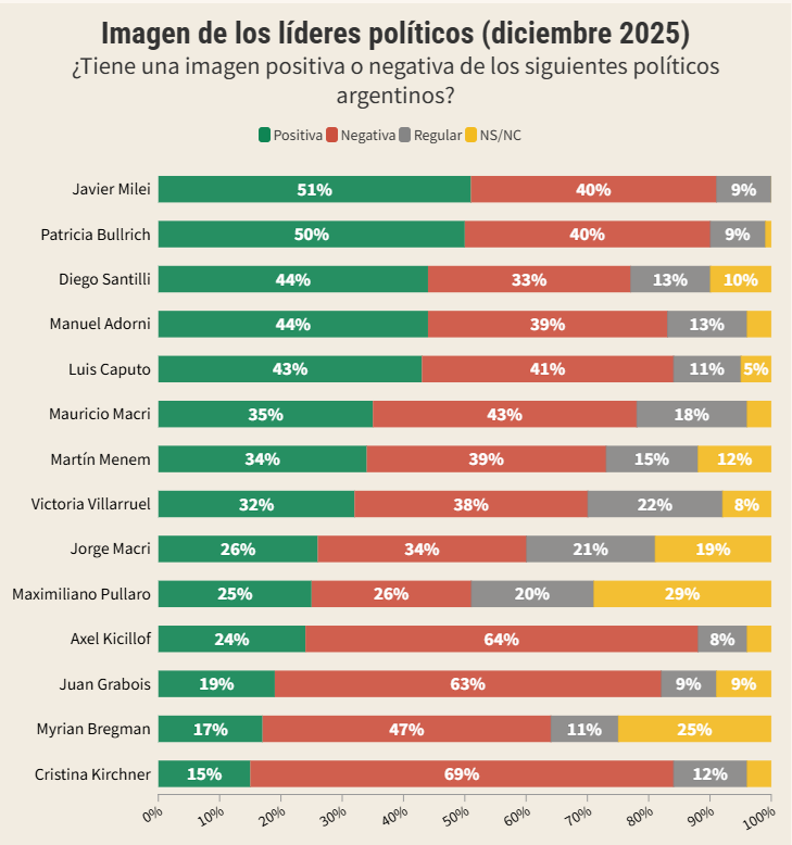 El relevamiento, que consultó a 2.281 personas mayores de 16 años, en todo el país, entre el 12 y el 19 de diciembre, muestra un panorama político marcado por fuertes polarizaciones y la consolidación de nuevas figuras en el escenario público.