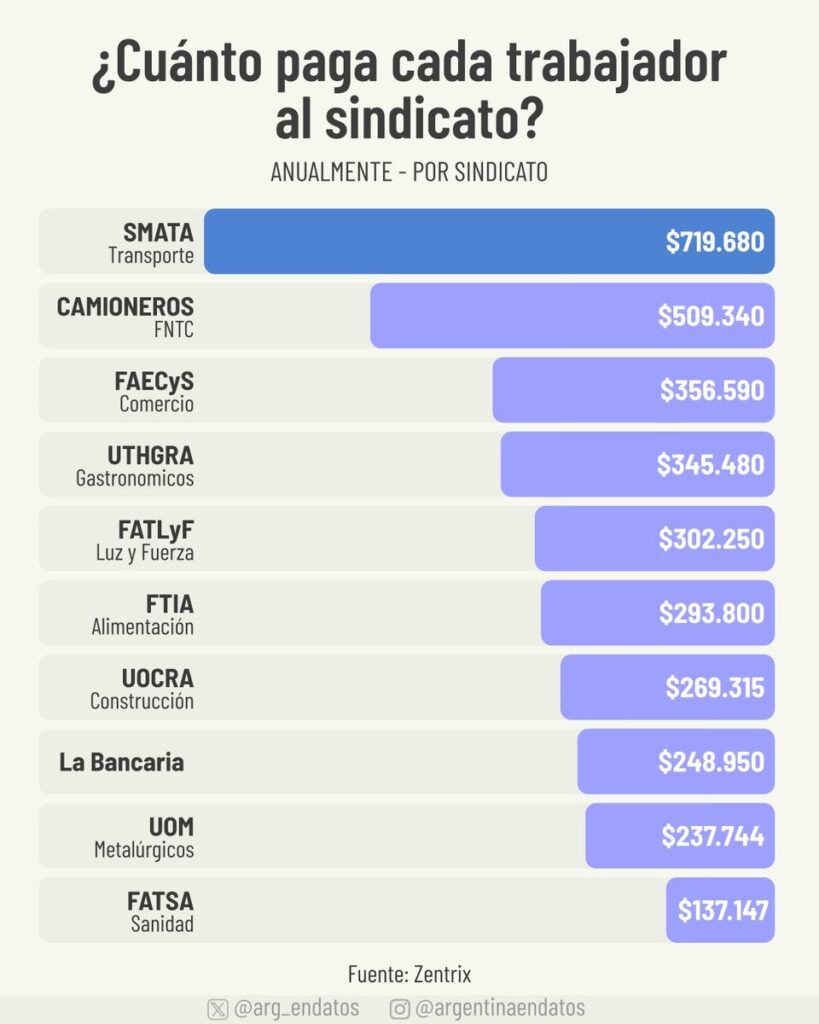 El estudio de Zentrix desagrega también la escala de estos fondos. Comercio lidera con USD 304,6 millones al año; le siguen Camioneros, con USD 79,5 millones; Construcción, USD 65,7 millones; SMATA, USD 56,1 millones; Metalúrgicos, USD 48,3 millones; Gastronómicos USD 45,1 millones; Sanidad USD 32,6 millones; Alimentación, USD 24,9 millones; La Bancaria, USD 16,9 millones; y Luz y Fuerza, USD 11,3 millones.