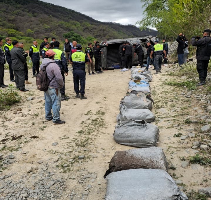 El Jefe de Policía, Joaquín Girvau, quien se dirige al lugar comentó que “personal policial ya resguardó la zona, la camioneta sufrió un vuelco y la droga estaba escondida en bolsas de arpillera”.