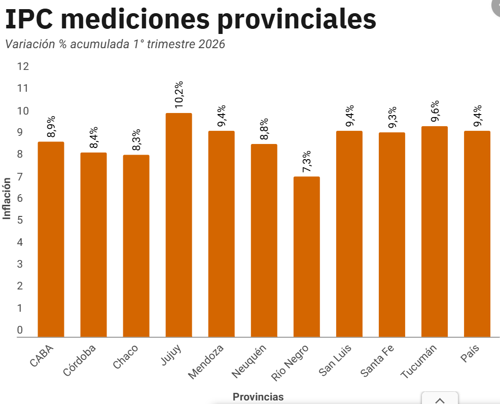 De acuerdo con el relevamiento de la consultora, Jujuy se posicionó como la provincia con la inflación más alta del país durante el primer trimestre de 2026. La provincia del Noroeste registró una suba acumulada del 10,2%, ubicándose 0,8 puntos porcentuales por encima de la media nacional.