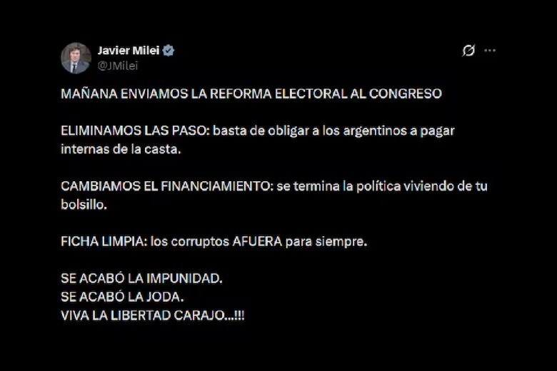 El Presidente Javier Milei anticipó, este martes por la tarde, que el Ejecutivo enviará mañana -el miércoles- el Proyecto de Reforma Electoral al Congreso. A través de un breve posteo en X anticipó que la iniciativa incluye: la eliminación de las PASO, cambios en el financiamiento de las campañas, y la implementación de Ficha Limpia. “Se acabó la impunidad. Se acabó la joda. Viva la libertad carajo”, coronó el mandatario en la plataforma.