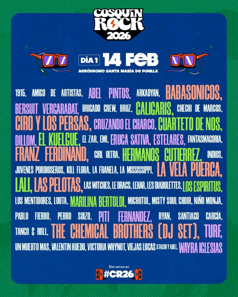Además, el festival será hogar de leyendas argentinas como Divididos, Babasónicos, Ciro y los Persas, Fito Páez, Las Pelotas, Las Pastillas del Abuelo, Los Caligaris, Viejas Locas (x Fachi y Abel), Airbag y Lali, entre muchos otros. La grilla se completa con artistas de distintas generaciones y estilos como Dillom, Marilina Bertoldi, El Cuarteto de Nos, Turf, Cruzando el Charco y El Plan de la Mariposa, mostrando un cruce que va del rock al trap, del indie al blues y de la canción al punk.