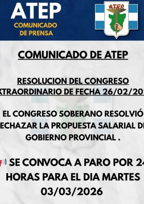 La Agremiación Tucumana de Educadores Provinciales (ATEP) rechazó la oferta salarial presentada por el Gobierno provincial y convocó a un paro de 24 horas para el próximo martes 3 de marzo, jornada prevista para el inicio de clases en la provincia.