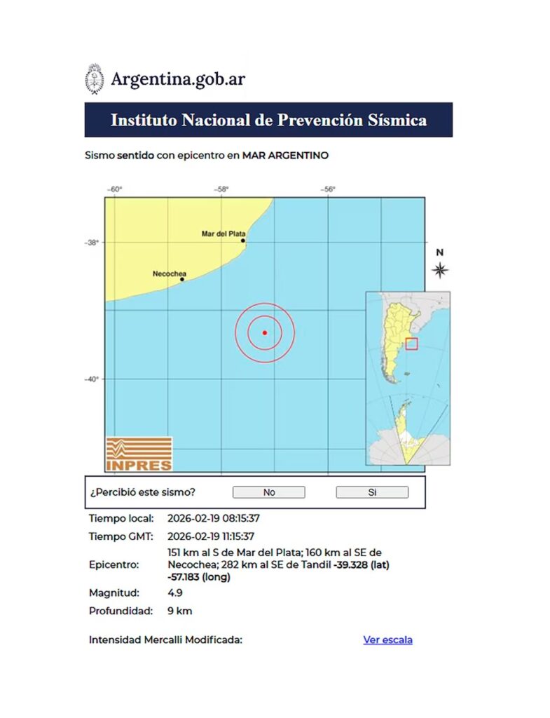 Según informó el Instituto Nacional de Prevención Sísmica (INPRES), el temblor se registró a las 8:15 en medio del Mar Argentino, con epicentro a 151 kilómetros al Sur de la ciudad balnearia