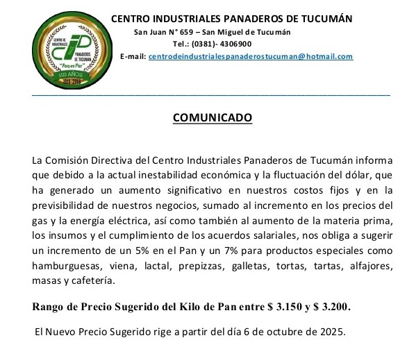Lo anunciaron desde el Centro de Industriales Panaderos a través de un comunicado