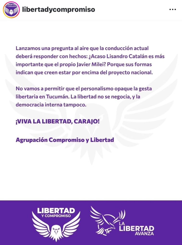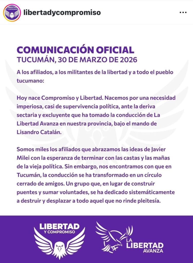 El dirigente libertario Gastón García Zavalía formalizó su ruptura con la conducción de La Libertad Avanza (LLA) en Tucumán y anunció la creación del nuevo espacio “Compromiso y Libertad”. La decisión se dio en medio de duras y directas críticas al titular provincial del partido, Lisandro Catalán, a quien acusó de ejercer un manejo “sectario”, “excluyente” y sumamente personalista de la estructura local.