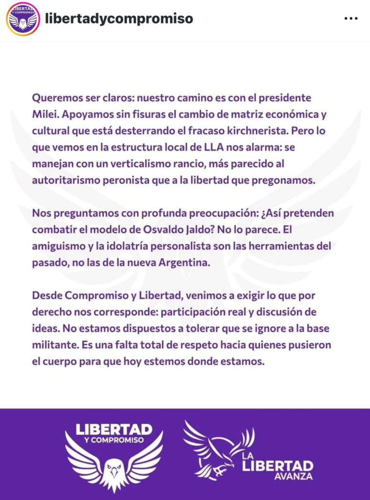 A través de un encendido comunicado, el ex integrante de la mesa chica libertaria afirmó que su salida responde a una “necesidad imperiosa, casi de supervivencia política” frente a lo que describió como un armado reducido a “un círculo cerrado de amigos” que, según denunció, desplaza sistemáticamente a quienes no se alinean de forma absoluta con la conducción oficial.