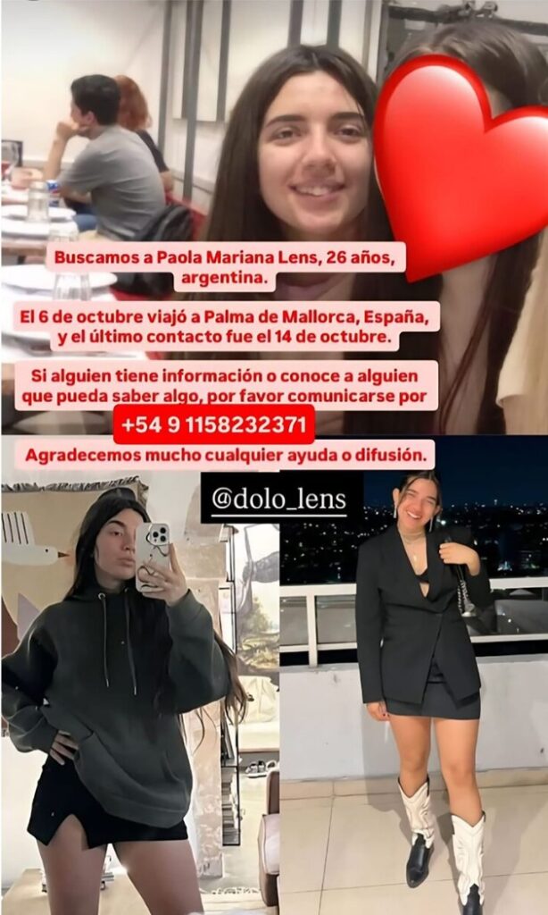 Paola Mariana Lens es oriunda de Villa Devoto, viajó a España a comienzos de mes tras recibir una oferta laboral. Iba a trabajar como niñera en Palma de Mallorca para una familia alemana radicada en la ciudad. Se fue contenta y con un objetivo claro: ahorrar para luego ir a Andorra y hacer la temporada de esquí. Sin embargo, ocho días después de llegar a destino, desapareció.