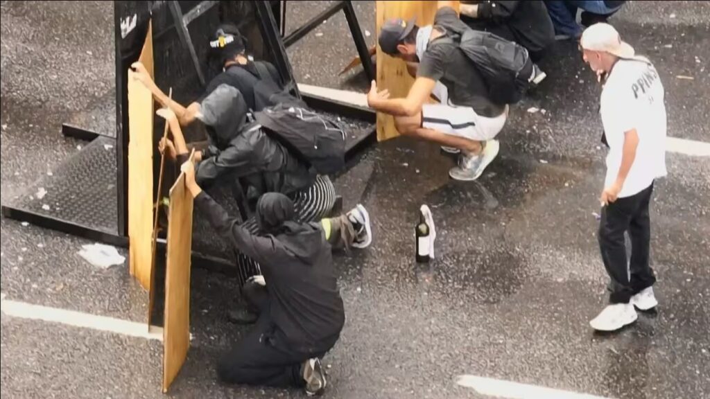 Varios integrantes de grupos de izquierda comenzaron un conflicto con la Policía sobre Rivadavia minutos después de las 15:00. Algunos manifestantes sacaron un vallado y lo usaron para intentar golpear a los agentes, mientras que otro hombre tomó un palo para agredir a los oficiales que formaron una columna de contención detrás de la valla.