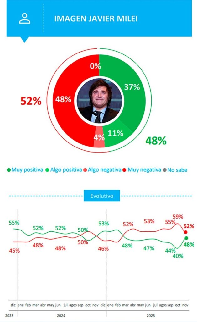 El estudio indica que después del triunfo electoral se recompusieron significativamente las expectativas en torno al Gobierno nacional y la imagen positiva de Javier Milei creció ocho puntos después de cuatro meses consecutivos de caída. También bajó su imagen negativa: ahora, el presidente tiene, según Opina Argentina, 48% de valoración en su favor y 52% en contra. De todas maneras, el saldo aún se mantiene levemente negativo.