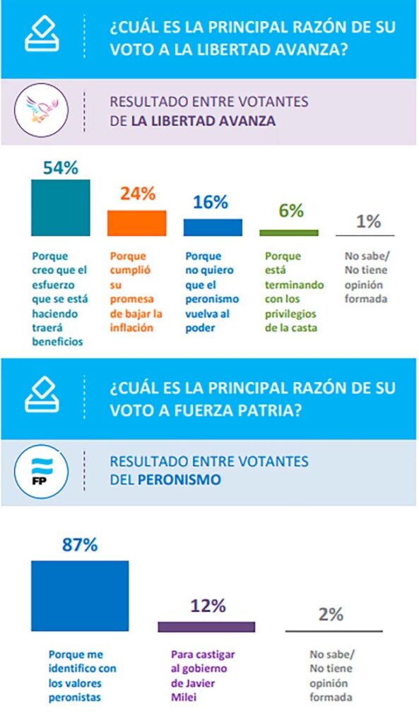 En tanto, entre los votantes de Fuerza Patria, la principal causa de su voto fue la identificación con los valores peronistas (87%) y apenas el 12% lo hizo “para castigar al gobierno de Javier Milei”.