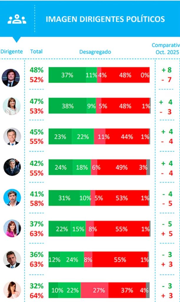 Luego vienen Mauricio Macri (45% y 55%), el ministro de Economía Luis Caputo (42% y 55%), Axel Kicillof (41% y 58%), Cristina Kirchner (37% y 63%), Sergio Massa (36% y 63%) y Victoria Villarruel (32% y 64%).