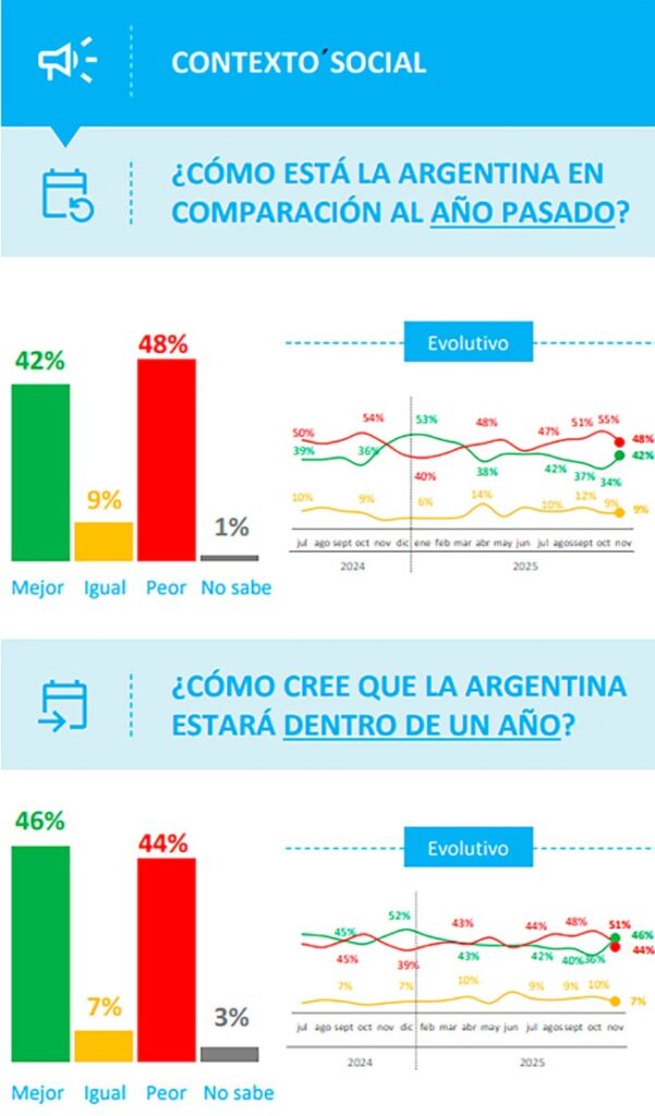 A la vez, según la encuesta, el resultado electoral mejoró el examen sobre el presente y las expectativas a futuro del país. Para el 42% de los consultados, la Argentina está mejor que el año pasado, para el 9% está igual y para el 48% está peor. En el evolutivo de esta pregunta, hay un crecimiento de la percepción de estar “mejor”, que pasó de 34% a 42% y una caída del “peor”, de 55% al 48%.